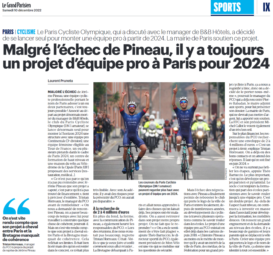 En s’appuyant sur son équipe de Division Nationale 1, son Centre de Formation et son ancrage à Paris, le Paris Cycliste Olympique a dévoilé dans Le Parisien et dans Cyclisme Magazine ses ambitions de créer une équipe professionnelle mixte H/F à Paris qui aura pour but d’offrir un débouchés aux championnes et champions formés en Ile de France.